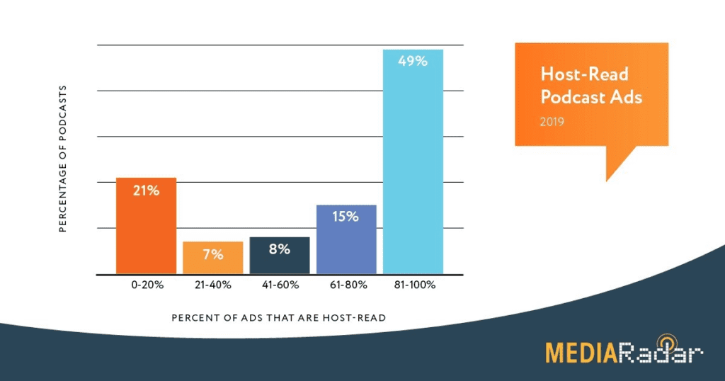 In fact, 63% of podcasts are host read, while almost half of podcasts had the majority (at least 8 out of 10) of their ads read by the host.