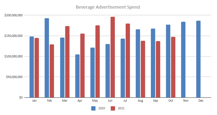 In the overall category, beverage advertisers had a 59% retention rate between 2020 and 2021 (January – October).