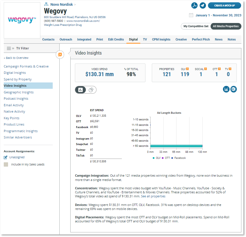 Wegovy loosened its belt on advertising to spend more than $131 million through November. Digital media was the focus, with OLV ads at 99% of the spend. Ad tech providers were responsible for 99% of the investment, which was the majority with YouTube ads longer than 60 seconds. The weight loss prescription, along with Ozempic, isn’t a stranger to the public. It was mentioned in diabetes and obesity prescriptions advertising data featured in CNBC’s article among many others.