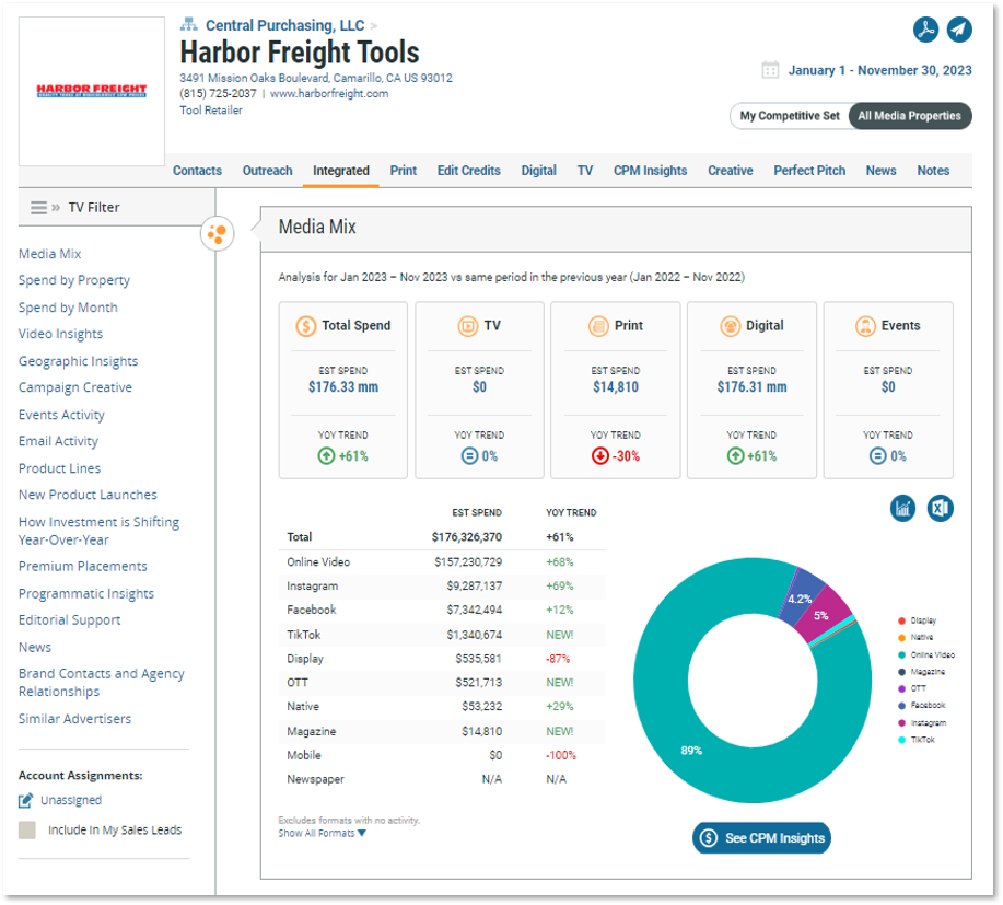 Harbor Freight Tools dedicated its $176 million in national advertising predominantly to digital media in 2023, with online video capturing 89% of spend, after a 68% YoY increase to $157mm. Those searching for tools for a variety of home improvement, automotive, and maintenance projects saw ads on YouTube’s Society & Culture, Music, and Gaming channels among others. Paid social ads with Instagram, Facebook, and TikTok were around 10% of the advertising spend.