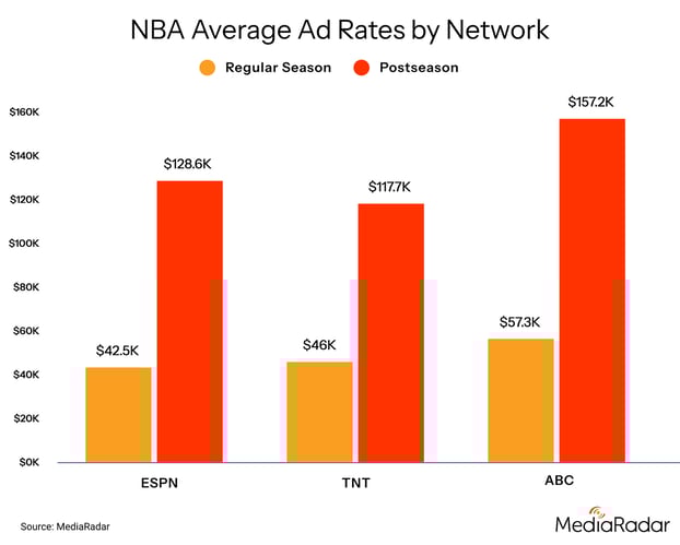 When the NBA Playoffs begin, the stakes go up—not just for teams, but for advertisers too. MediaRadar’s latest data reveals a surge in NBA playoff advertising rates across ABC, ESPN, and TNT. Ad rates more than double during postseason broadcasts, and the networks reap the rewards.